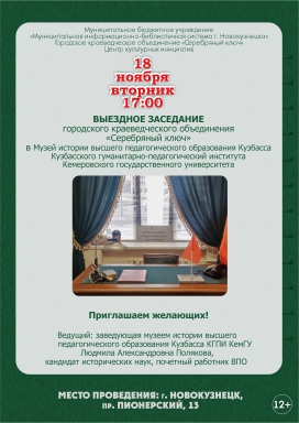 18 ноября в 17.00 в здании КГПИ КемГУ по адресу: пр. Пионерский, 13 состоится выездное заседание (экскурсия) городского краеведческого объединения «Серебряный ключ» им. С. Д. Тивякова, действующего при поддержке КРО ВОО «Русское географическое общество» в Музей истории высшего педагогического образования Кузбасса КГПИ КемГУ.