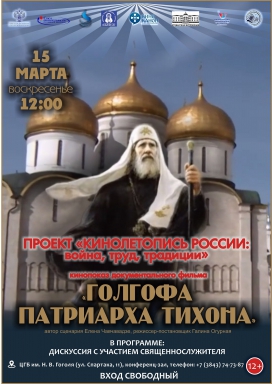 15 марта в 12:00 в конференц-зале библиотеки им. Н.В. Гоголя состоится показ документального фильма «Голгофа патриарха Тихона» (2025 г.), автор сценария Елена Чавчавадзе, режиссер-постановщик Галина Огурная. Мероприятие пройдет в рамках кинопросветительского проекта «Кинолетопись России: война, труд, традиции», реализуемого Союзом кинематографистов РФ при поддержке Министерства культуры РФ.