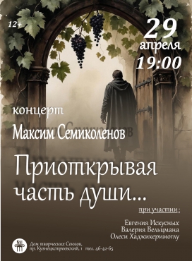 И именно об этом – о нас самих, о наших самых сокровенных мыслях и чувствах – пойдет речь на концерте Максима Семиколенова «Приоткрывая часть души», который состоится 29 апреля в 19:00 в Доме творческих Союзов.🤗