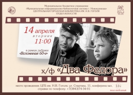 14 апреля в 11:00 в конференц-зале Центральной городской библиотеки им. Н. В. Гоголя (ул. Спартака, 11) состоится занятие ретро-видеосалона «Забыть невозможно». Мероприятие пройдет в рамках рубрики «Вспоминая 60-е». Гости мероприятия посмотрят пронзительную советскую драму «Два Федора», снятую в 1958 году на Одесской киностудии .