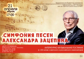 21 апреля в 17:00 в модельном молодежном зале «Твоя территория» библиотеки им. Д.С. Лихачёва состоится литературно-музыкальная гостиная «Симфония песен Александра Зацепина».